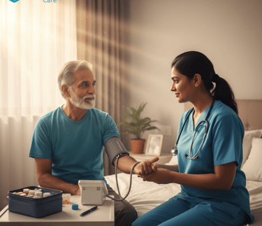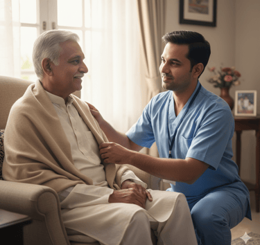"At Samarpan Care, our caretakers make the transition from hospital to home smooth and stress-free. We assist with daily routines, ensure timely medicines as prescribed, support with light exercises or mobility as guided, and provide warm companionship — helping your loved one regain strength with dignity and comfort."